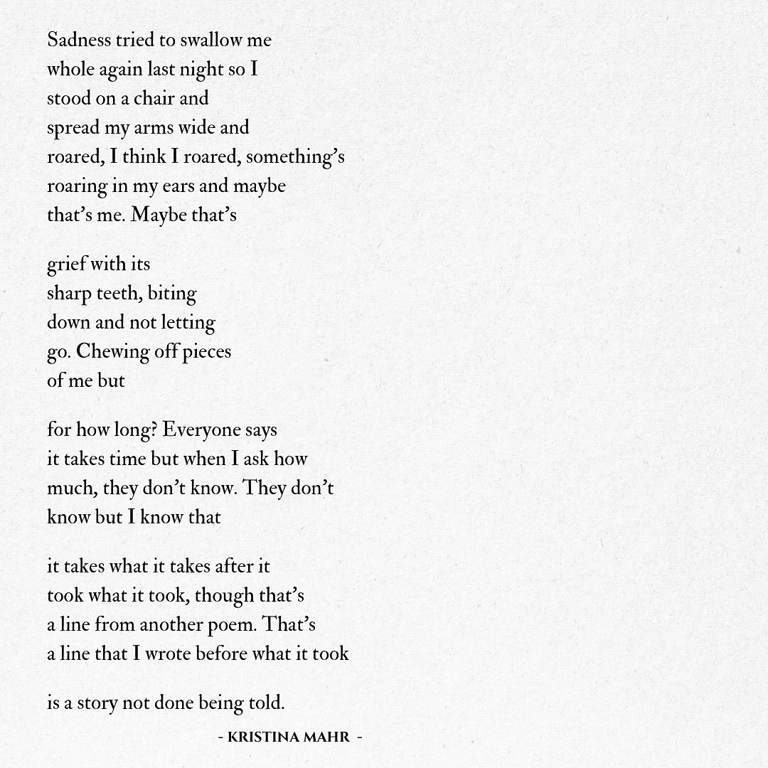 When I was a child I loved poetry. I read every book of poems I could get my hands on & also wrote my own. I have several notebooks filled with poems, long & short, on a variety of topics. Somehow I lost that as I got older and stopped reading poetry. Now, in my grief, I have found myself drawn to it again, finding it comforting & healing. Maybe it’s that feeling of “home” for me, since it was such a part of my childhood. One of my faves recently is Kristina Mahr who writes about loss & grief & love. I think I’ve shared a few of her short poems here already, but here’s another one that especially resonated with me today: