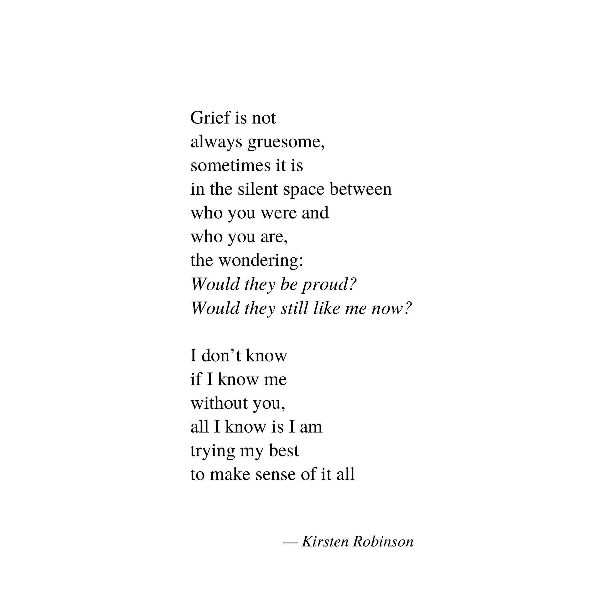 This little poem expressed exactly how I feel these days. That “space between” who we were & who we are can be so confusing & scary. There’s a lot of questioning myself; am I making enough progress? Am I working hard enough on my goals? Am I fulfilling my purpose? As Kirsten says in her poem, “Would he be proud of me? Of who I have become?”